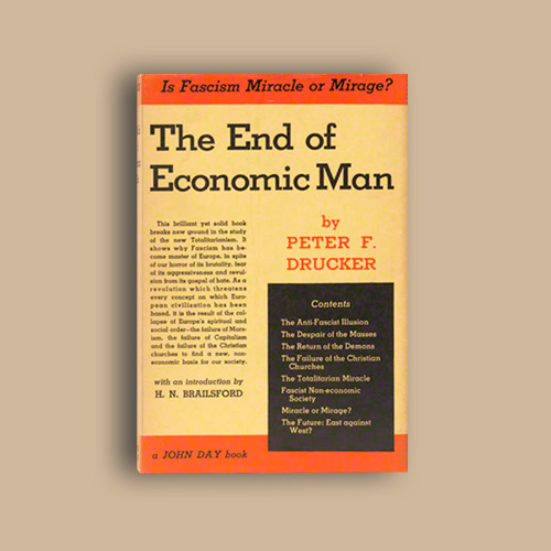 Druckers erste Bücher sind politische und gesellschaftliche Analysen -The End of Economic Man (1939) und The Future of Industrial Man (1942) Sein Grundanliegen ist die Frage nach einer gesunden, funktionierenden Gesellschaft und nach jenen Hauptproblemen, die jede Gesellschaft zu lösen hat - nach Status und Funktion ihrer Mitglieder und nach ihren grundlegenden Organisations- und Koordinationsformen. Seine Auffassungen entstanden zwangsläufig in Auseinandersetzung mit den totalitären Systemen Europas, denen der junge Drucker Anfang der 30er Jahre durch Emigration - aus freiem Entschluss - zuerst nach England und dann nach Amerika ausgewichen war.