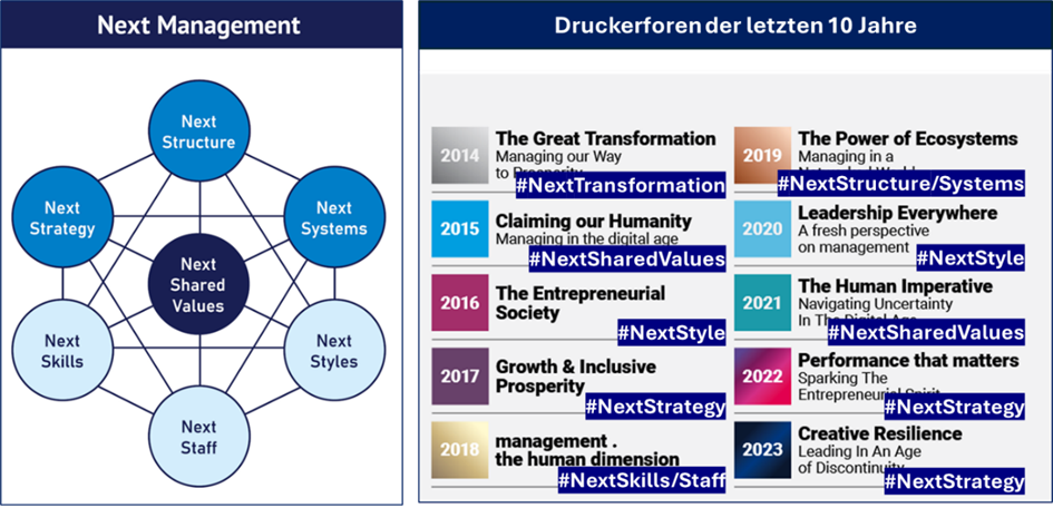 2024 will draw together the individual topics of the past decade. It will begin to paint the big picture of Next Management and that of 2010’s “the Next Society”. This brings us full circle. 10 years of the Drucker Forum also confirm the salience of Straub’s seven propositions. The Next Management promises to be a strongly positive development.
