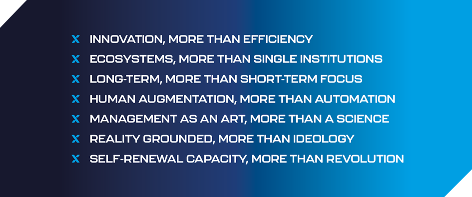 - Strategy: The old dehumanizing economic logic of efficiency and scale will be replaced by a new, innovation orientation; unsustainable greed will give way to broad long-term value creation (Performance that Matters, 2022, Creative Resilience, 2023).