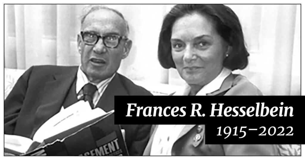 Frances Hesselbein, whose leadership of the Girl Scouts of the United States of America from 1976 to 1990 turned a failing not-for-profit into one of the greatest socially serving institutions of the 20th and 21st centuries, died on December 11th, 2022 at her home in Easton, PA.  Surrounded by loved ones, she was 107. Throughout her storied career, Frances Hesselbein often changed the life of a Girl Scout, an aspiring student, a military officer, or a business executive with a single conversation.