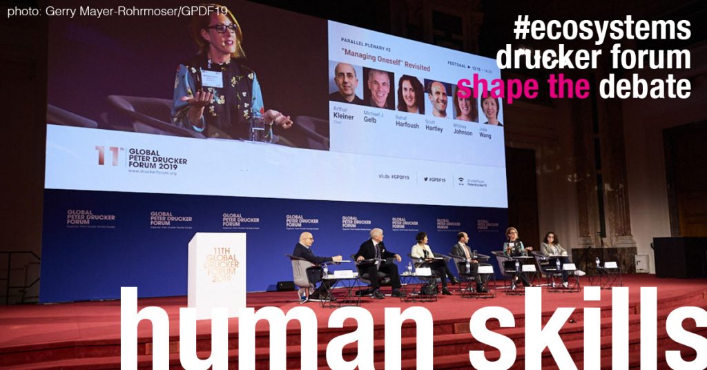 In a networked world, opportunities for individuals to develop, create and grow are available everywhere. Whether they can successfully capture the opportunity or surf on the wave of the changes, depends heavily on the individual ability to manage oneself. At the 11th Global Drucker Forum on “The Power of Business Ecosystems” on November 21, 2019 in Vienna, one plenary discussion on the theme of “Managing Oneself” drew on Peter Drucker’s 1999 article of the same name to bring new perspectives on leadership, innovation, and organizational resilience and agility in the context of ecosystems today.