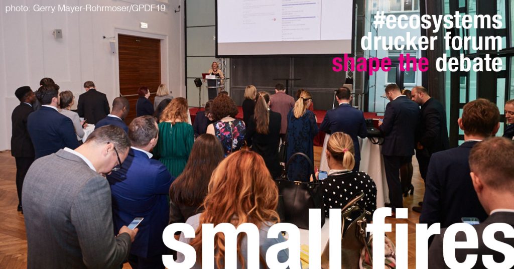 The shortened ‘Barcamp’ format used within the Global Peter Drucker Forum sees pitches by participants, followed by an audience vote to select the most popular topics that will then be presented in a short talk. Ample discussion time is provided thereafter.