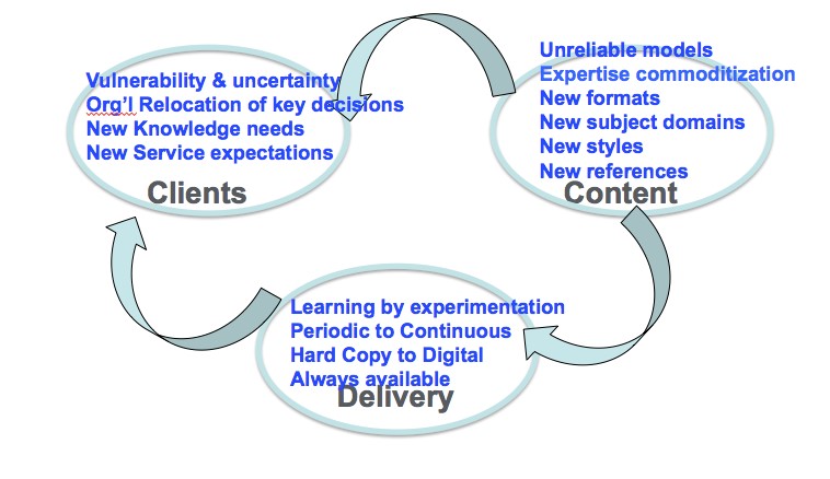 In fact, as if in a perfect storm, not only is the character of expertise changing, but at the same time, new client needs, and new clients, are emerging and the potential for new delivery of expertise content is also changing in fundamental ways. Firms are fearful of being vulnerable to an unknown [not uncertain] future; and at the same time, conditioned by living in an internet world, they expect instant knowledge responses at reasonable prices. Expertise providers are finding that the models that they have long-relied upon [e.g., the familiar five forces model] are losing some of their potency, as they are based upon assumed knowledge that is increasingly difficult to determine [What industry are we in? Who are our competitors? What are our core-competencies?]. Finally, in a world where advancement is being driven more by experimentation than by reliance upon experts, and where the need for advice has moved from episodic to continuous, the entire delivery model for expertise is also being reinvented, leaving an entire expert value-chain from classical university education, post-graduate professional certification, to continuous education, in disarray: