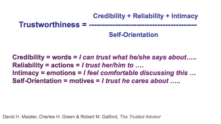 If expertise is over, or at least no longer commanding its traditional premium in the marketplace, and if the old ways of conveying expertise are also in upheaval, what then do experts have to offer? An answer might be found in David W. Maister et.al.’s trust equation for the professional service firm: