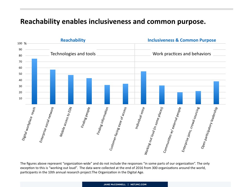 Digital technologies, deployed and adopted intelligently, increase reachability throughout the organization. Social networking, enterprise search, people search, real-time chat, collaboration spaces and so on are available today in most organizations. Unfortunately, these systems do not always encompass the entire organization and small and even large pockets of people are not reached. (See data at the end of the post.)