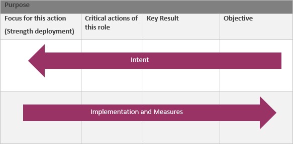 • Appreciation of the application of the intent, objective, key result, critical action, strength deployment and reverse pathway (see diagram). This can help realize the context of expectation, contribution and intent. With a shared sense of purpose it is a lot easier to ensure that all involved within performance and any improvement journey realize their roles and take responsibility rather than ‘blame’ others if performance doesn’t change. (This is an adaptation of the Impact Maps introduced by Robert Brinkerhoff in Success Case Method 2005)