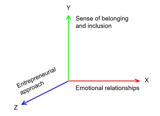 To engage with information, we need to be emotionally involved (X) feeling curiosity and interest. To stay involved and deepen the understanding by evolving with a learning community we should cultivate belonging and inclusion (Y). What makes a learning experience truly 3-dimensional is the understanding that it’s a dynamic proactive entrepreneurial process of creating knowledge and sharing ideas (Z).