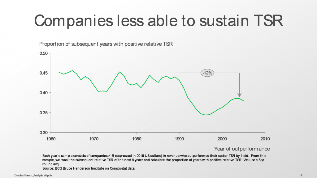 Addressing these threats will require not just setting different goals, but also adopting a different mindset. Business thinking has been dominated in recent years by the idea of maximizing Total Shareholder Returns (TSR). Such a philosophy is arguably appropriate to a situation where two conditions hold: 1) there are minimal externalities from business impacting the broader system beyond the company; and 2) the game is well established enough that emphasis on exploiting it fully makes sense, but not so mature that the exploration of new possibilities becomes critical. Clearly, these conditions do not hold today. Maximizing a rate of return which also incorporates expectations, creates an unsustainable ratchet effect. As the graph shows, after a period of high TSR performance, there is rapid regression to the mean. And the strength of the effect is increasing over time.