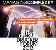 Dear Reader,For the Peter Drucker Society Europe a very important year is coming to an end. The fifth Global Peter Drucker Forum has attracted top speakers and participants from around the globe (350 participants from 48 countries plus some 1000 registrations to the live stream). Due to important partnerships with key business and management media such as Harvard Business Review and the Financial Times and increasing presence on social media the Forum reached a new level of global visibility and recognition. In preparation of the conference and during the event an important body of knowledge has been created that we have made accessible to you all. Please see the landing page for the conference documentation. Enough to keep you busy during the upcoming Holidays... In 2013 we had significant innovations: in addition to the Global Peter Drucker Challenge Essay Contest we have implemented a Video Contest as a world premiere for Management. The Oubey Exhibition brought the world of Arts directly into the Druker Forum. We appreciate the support and trust of those who have actively participated in the Forum and/or other Drucker Society Europe events. While we feel encouraged by the positive reactions that we receive - we see ourselves to be engaged in a continuous learning process and appreciate your feed-back. Please save the date for the Drucker Forum 2014 and the Launch Event.